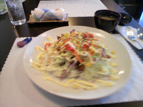 上部野菜沙羅汰の下には、充分な牛肉を盛りし。其の下に米飯なり。